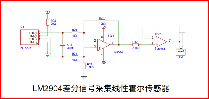 4.1圖一為薩科微運算放大器LM2904。該運放采集小信號進行放大,LM2904因其低輸入失調(diào)電壓和失調(diào)電流特點非常適合傳感放大器、音頻 放大器、工業(yè)控制、DC 增益部件和所有常規(guī)運算放大電路。上圖為薩科微LM2904差分采集的線性霍爾SL-322B經(jīng)過10倍放大輸出給MCU采集信號,來判斷磁場的位置和大小。線性霍爾SL-322B規(guī)格書有說明磁場強度對應(yīng)輸出電壓大小,經(jīng)過放大后就能得出該位置磁場值。該差分電路廣泛用于電壓采樣和電流采樣。