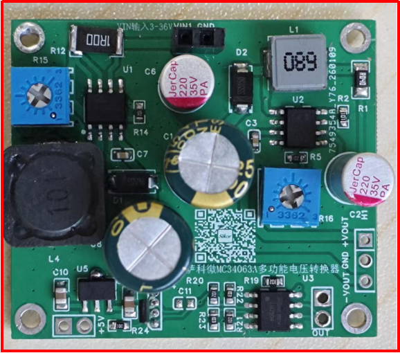 4.2圖二為薩科MC34063A微升降壓調(diào)節(jié)器。在輸入端接5V供電,調(diào)節(jié)電位器R15和R16能得到正負電壓,比如+-9V,+-12V來給運放放大器LM2904提供正負電壓源供電。MC34063A很方便就能實現(xiàn)一個負壓調(diào)節(jié)器。同時MC34063A是一款單片開關(guān)穩(wěn)壓器控制電路,包含直流-直流轉(zhuǎn)換器所需的主要功能。該器件由內(nèi)部溫度補償基準源、電壓比較器、帶有源電流限制電路的可控占空比振蕩器、驅(qū)動器和大電流輸出開關(guān)組成。