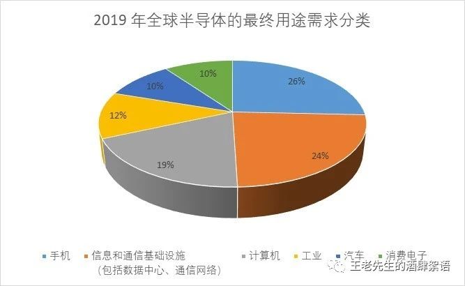 (上接第一部分:集成電路設計) 四、關于集成電路制造 (一)花旗國關于集成電路制造行業的基本估計 半導體產品幾乎為經濟的各個部門提供驅動動力,包括能源、醫療保健、農業、消費電子產品、制造和運輸。2019 年全球對半導體的最終用途需求為:手機(26%)、信息和通信基礎設施(包括數據中心、通信網絡)(24%);計算機 (19%)、工業(12%)、汽車 (10%) 和消費電子 (10%)。 在這些不同的應用中,有大約9%直接支持國家安全和關鍵