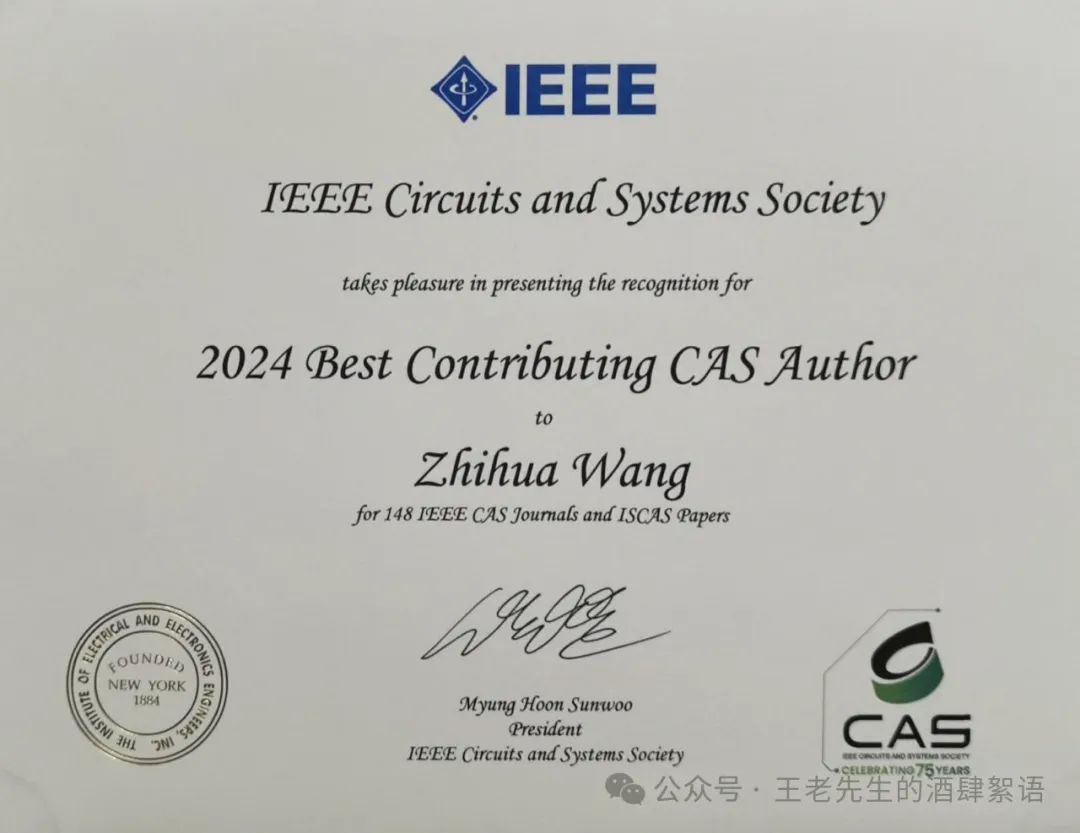 2024年5月21日,臺灣大學的鄭桂中教授在新加坡參加國際會議IEEE ISCAS(International Symposium on Circuits and Systems)現場拍攝的一張照片(圖1)。照片是是IEEE電路與系統學會(CASS - Circuits and Systems Society)的現任主席Myung Hoon Sunwoo述說CASS的成立75年以來、國際會議ISCAS舉辦58年以來的一些學術成就,包括了最佳貢獻作者獎。其中本人位于最佳貢獻作者獎之首。這個獎勵不是每年都頒發