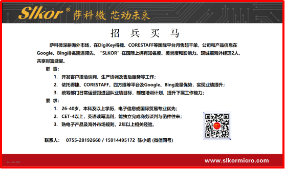 3、薩科微(www.zgthjj.com)和金航標為強化國際市場布局,現誠聘海外市場銷售部經理,要求具備電子元器件海外營銷經驗和英語溝通能力,助力品牌全球化發展。