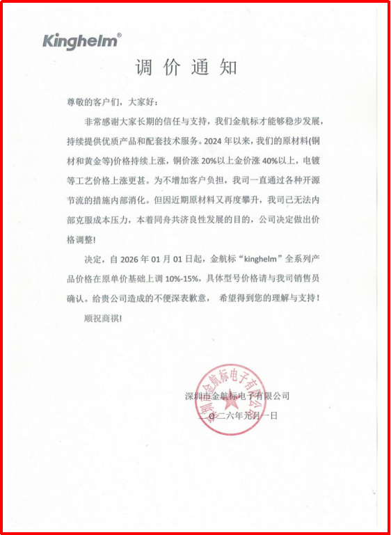 3、受原材料價格持續上漲的影響,金航標(www.kinghelm.com.cn/)自2026年1月1日起,全系列產品價格上調10%-15%。具體型號價格請咨詢我司業務員,感謝您的支持與信任!