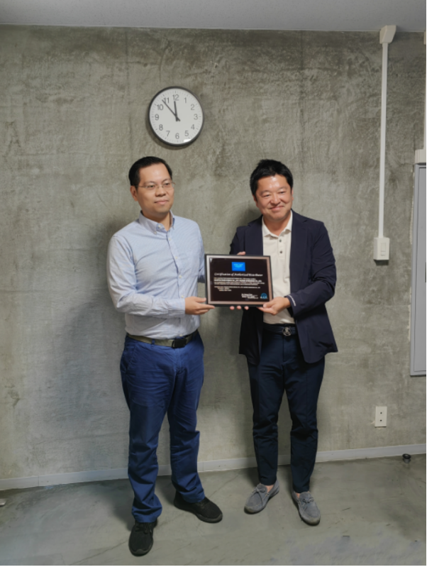 赫威斯電容董事陳東杰補發代理商牌匾予名古屋理研電具社長坂明憲