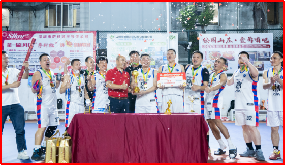 宋仕強(紅衣者)為“薩科微”杯籃球聯(lián)賽冠軍球隊頒獎