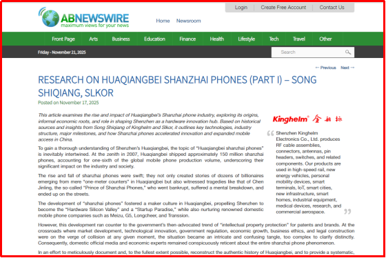 宋仕強論道之《“華強北山寨手機”研究(上)》英文版榮登ABN Newswire(亞洲財經(jīng)新聞)