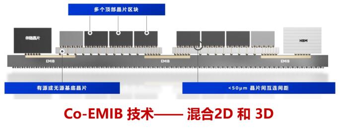 接下來,我將分享可擴展性軸(Z)上的內容,圖1的Z軸,代表可擴展性, Co-EMIB技術就在這一象限內。Co-EMIB技術通過使用 EMIB 和 Foveros 的組合來融合 2D 和 3D 的技術,我們通過 Co-EMIB將 40 多個芯片放入一個封裝中。