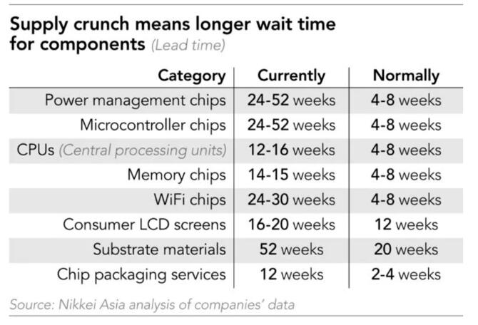 這次缺芯主要是電源管理IC和MCU。根據日經最近的統計數據顯示,電源管理芯片和MCU的交貨期最長,達到24-52周(半年到一年的交期)。
