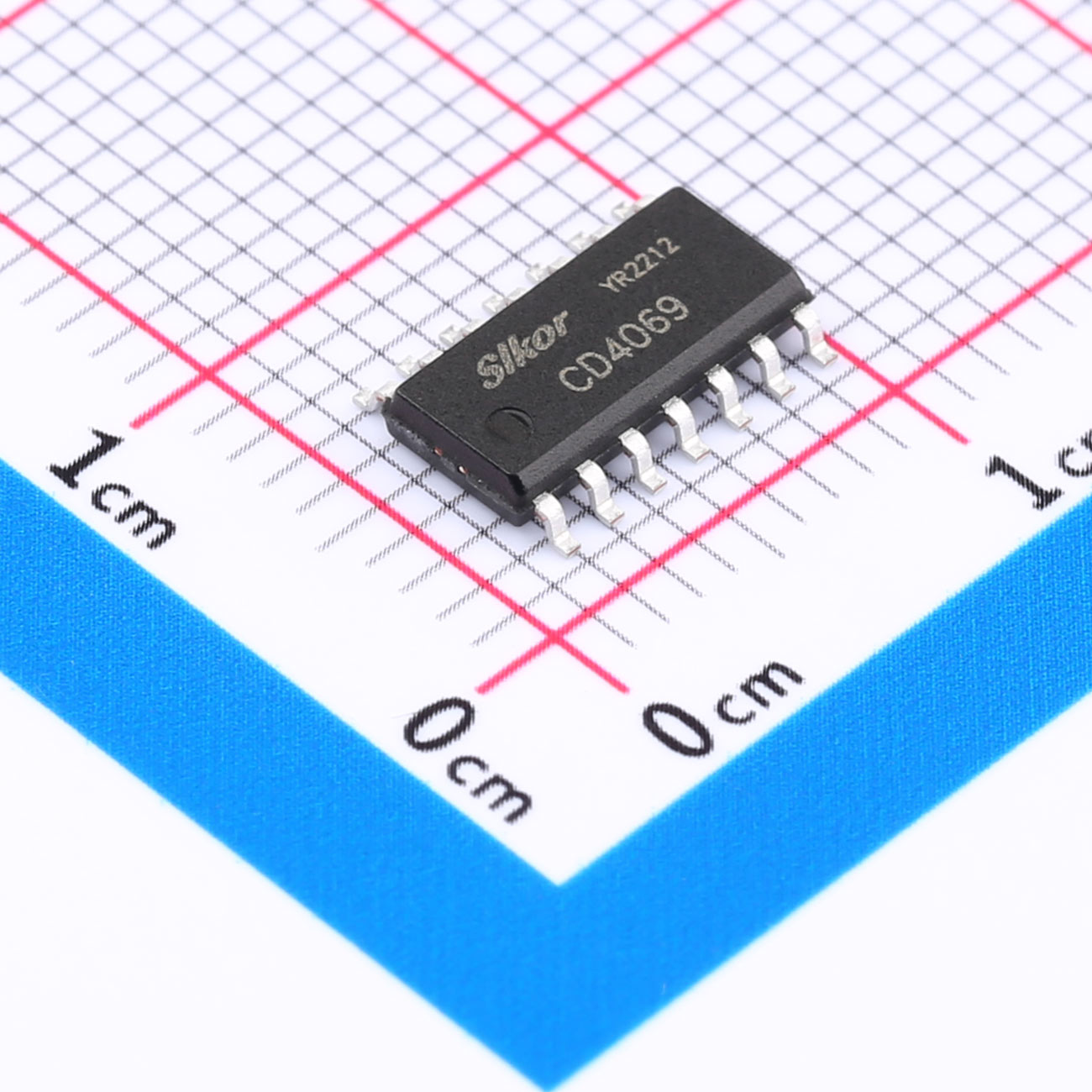 反相器CD4069 VDD(V):3V~15V IIN(A):1μA@15V 電路數(shù):6 輸入數(shù):1 IOL(A):24mA IOH(A):-3mA package:SOP-14