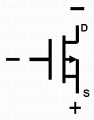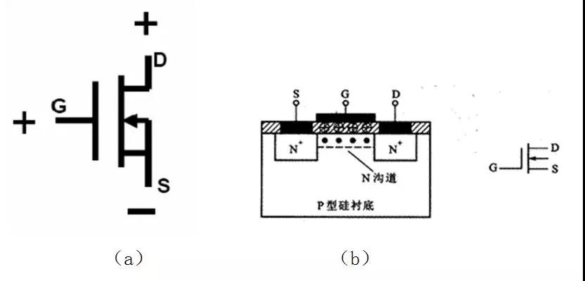 圖1-4-(a)是N溝道MOS管的符號,圖中D是漏極,S是源極,G是柵極,中間的箭頭表示襯底,如果箭頭向里表示是N溝道的MOS管,箭頭向外表示是 P溝道的MOS管。